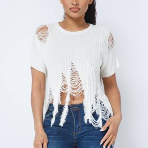 Wide Scoop Short Sleeve Distressed Sweater