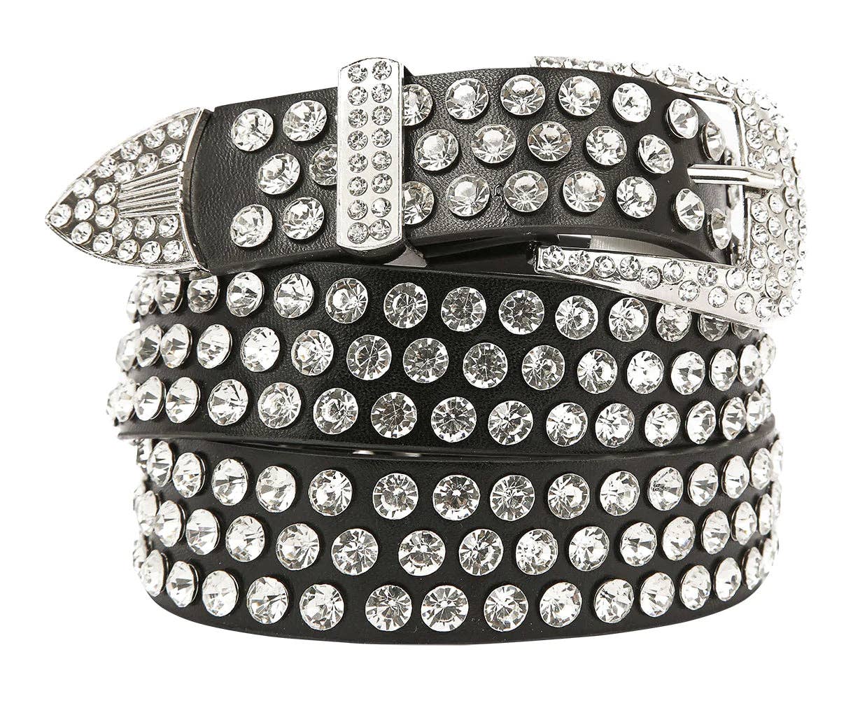 Rows of sparkling, mounted rhinestones highlight this superb accessory. * Genuine Leather. * Measures 1.25 inches wide. * Silver hardware. Approximate Size: Large approx.(38-42in) Model #: BTJ-2021L
