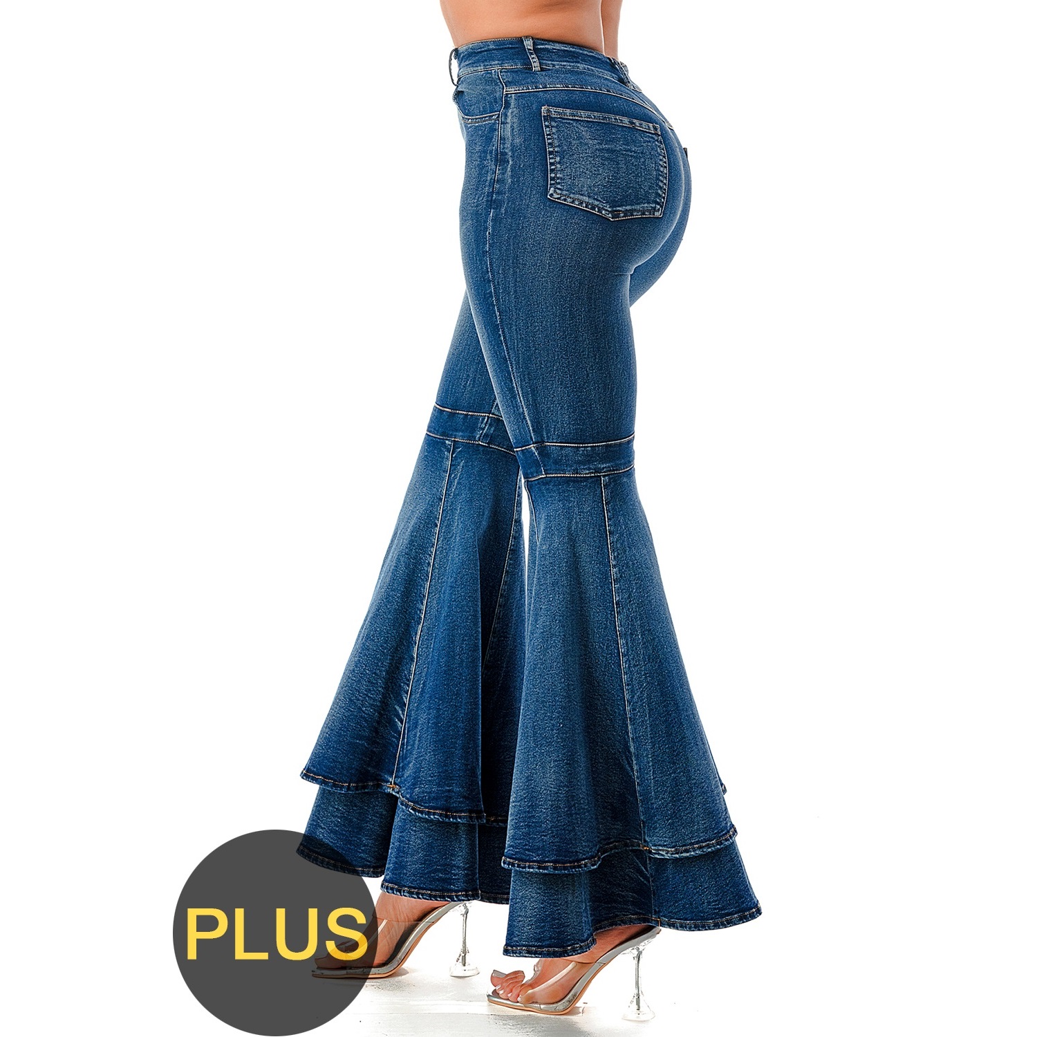 These medium denim high waist jeans are a trendy and stylish choice with their layered flare/bell bottom design. They offer a flattering fit and a fashionable look that can be dressed up or down for any occasion.